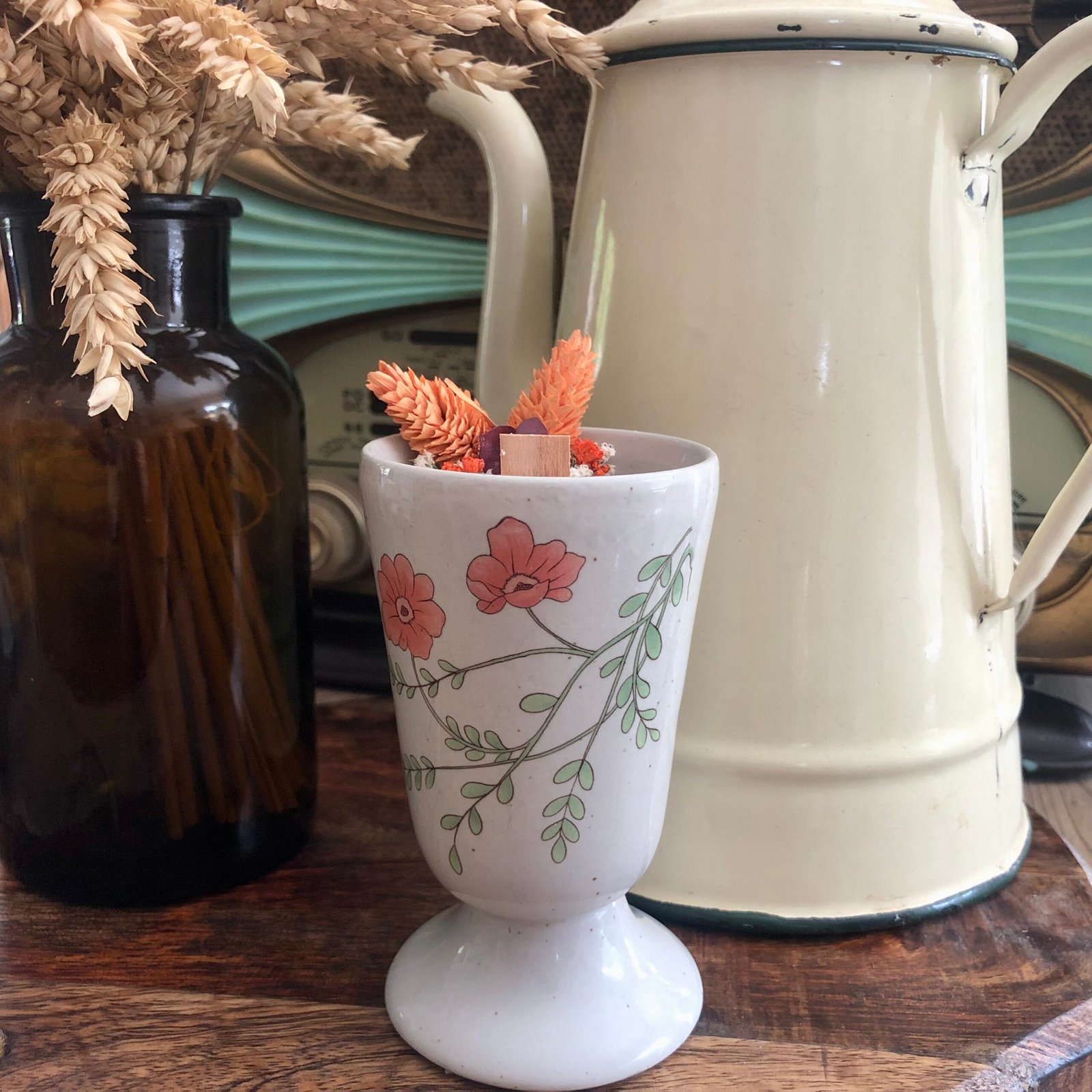 Bougie senteur mirabelle coulée dans un mazagran vintage. Donnez une seconde vie à ce mazagran floral et coloré. Bougie fabriquée à la main en cire de soja végétale, sans OGM et écologique. Elle est délicatement parfumée avec un parfum de Grasse, garantie sans CMR (substances cancérigènes, mutagènes ou reprotoxiques).