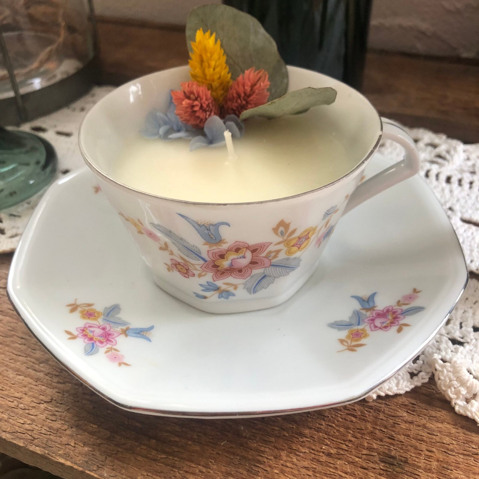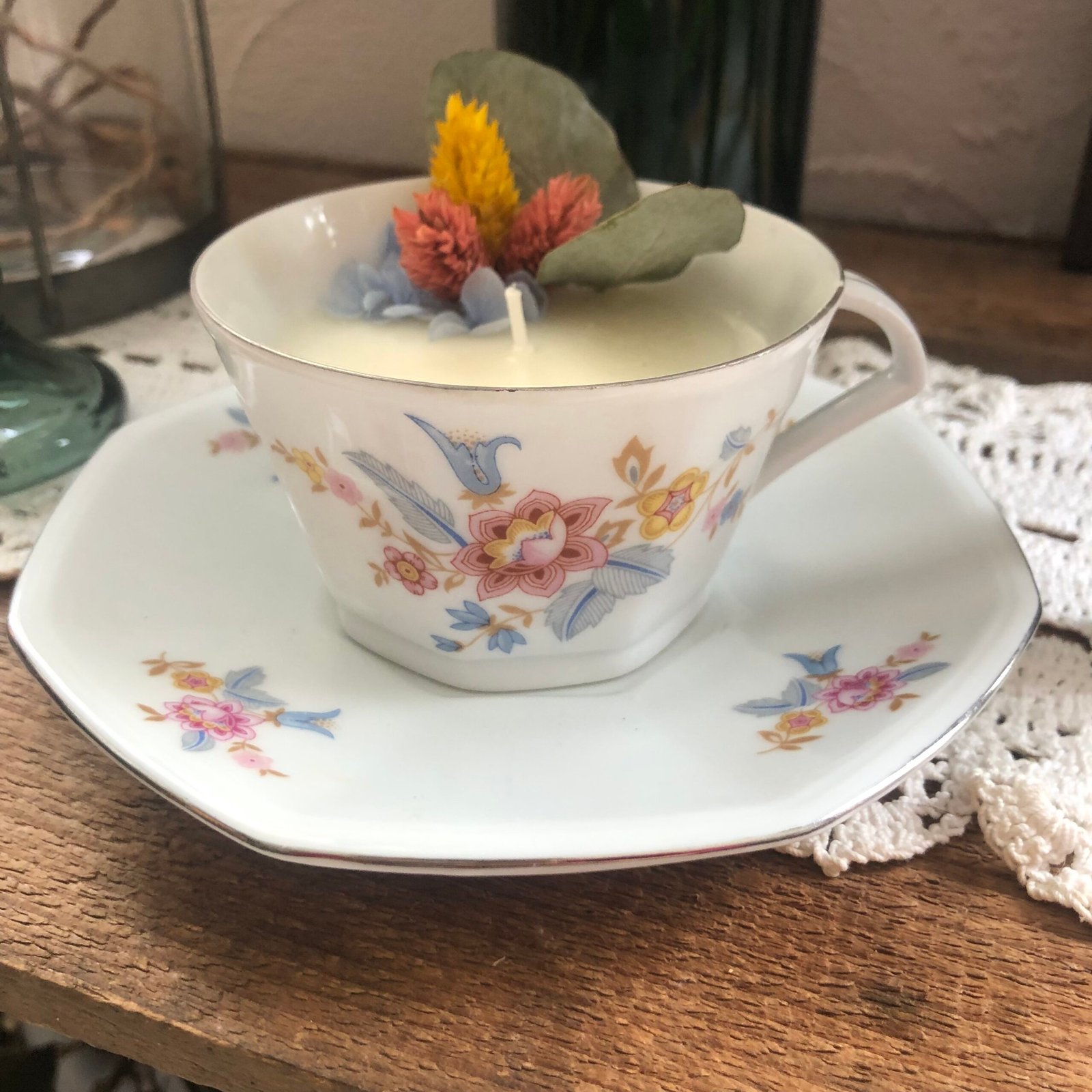 Bougie senteur agrumes coulée dans une jolie tasse à thé et sa soucoupe. Cette création colorée dans des tons pastels apportera une touche de douceur dans votre intérieur. Fabriquée à la main en cire de soja végétale, sans OGM et écologique. Elle est délicatement parfumée avec un parfum de Grasse, garantie sans CMR (substances cancérigènes, mutagènes ou reprotoxiques).